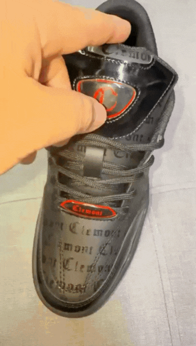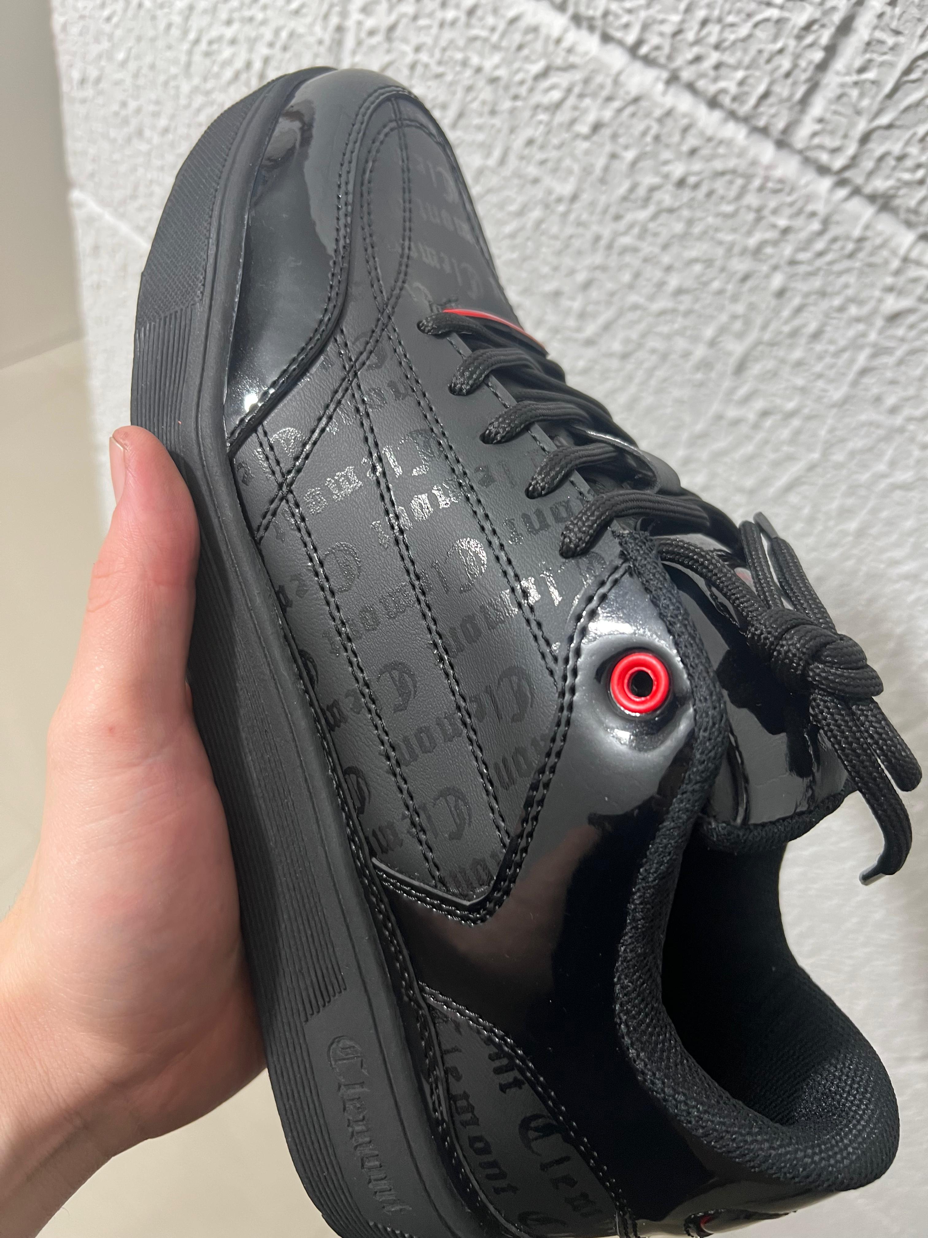 cordones planos negros con pasadores tipo ojal; pieza decorativa roja con el nombre Clemont en el empeine.